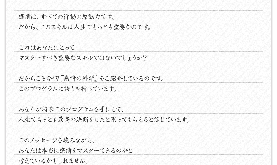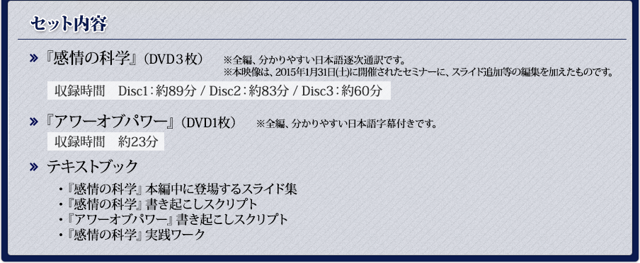 「特典2:『感情の科学』『アワーオブパワー』の音声ファイルをプレゼント」をご覧ください。